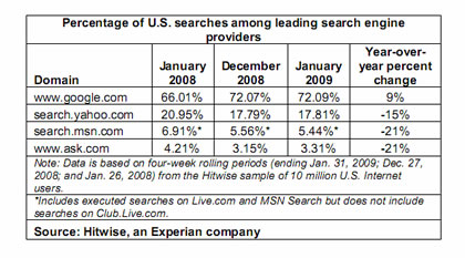 Hitwise的數據顯示,谷歌的搜索引擎市場份額保持穩步增長,同比增幅為9%。而其主要競爭對手的份額均出現下滑。