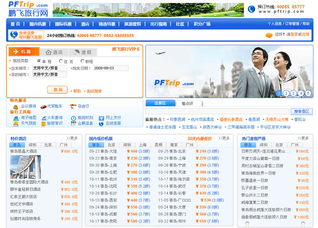 鵬飛旅行網(www.pftrip.com)是一家國內領先的、通過互聯網、電話呼叫中心以及無線技術開展航空旅游產品分銷的網絡服務商,由青島最大的航空售票服務一級代理公司——青島鵬飛國際航空旅游服務有限公司于2002年投資創建,目前是青島最大的電子客票代理商,也是國內最好的機票查詢預訂網站。